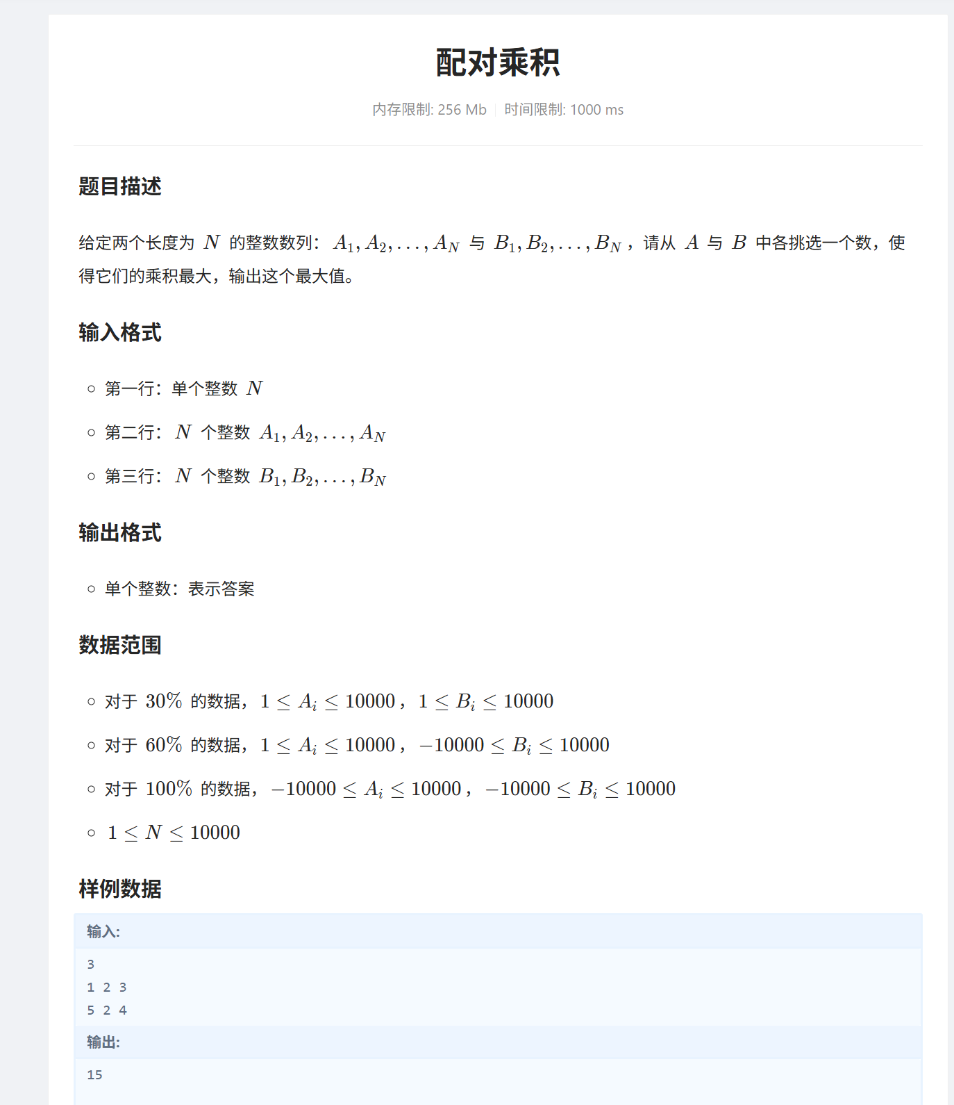 题解:查看数据范围发现,数据不是很大,所以采用二层循环来遍历每个数组进行交叉相乘的方式进行比较。找到最大值。