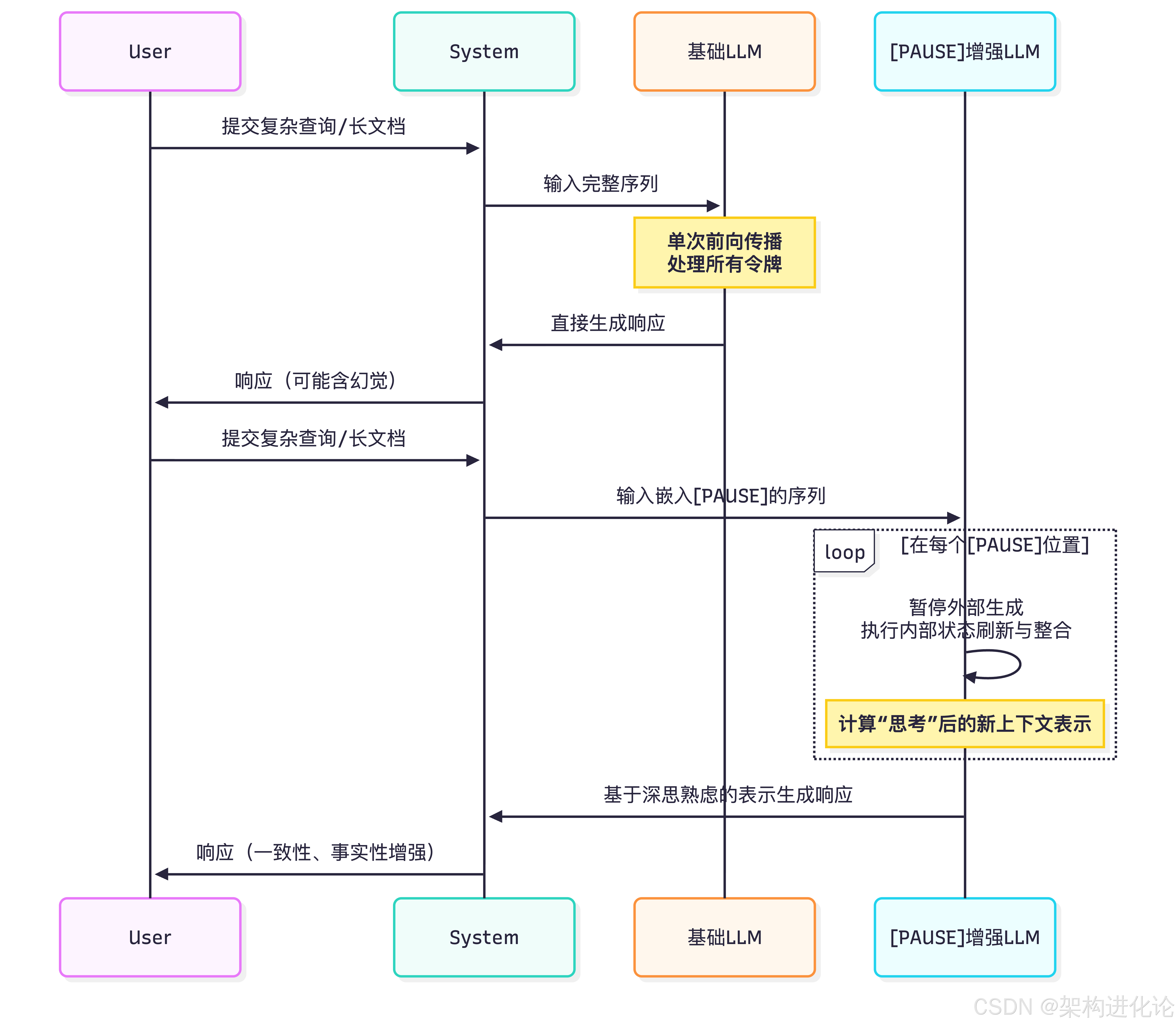以下序列图展示了[PAUSE]注入技术如何改变模型的推理流程: