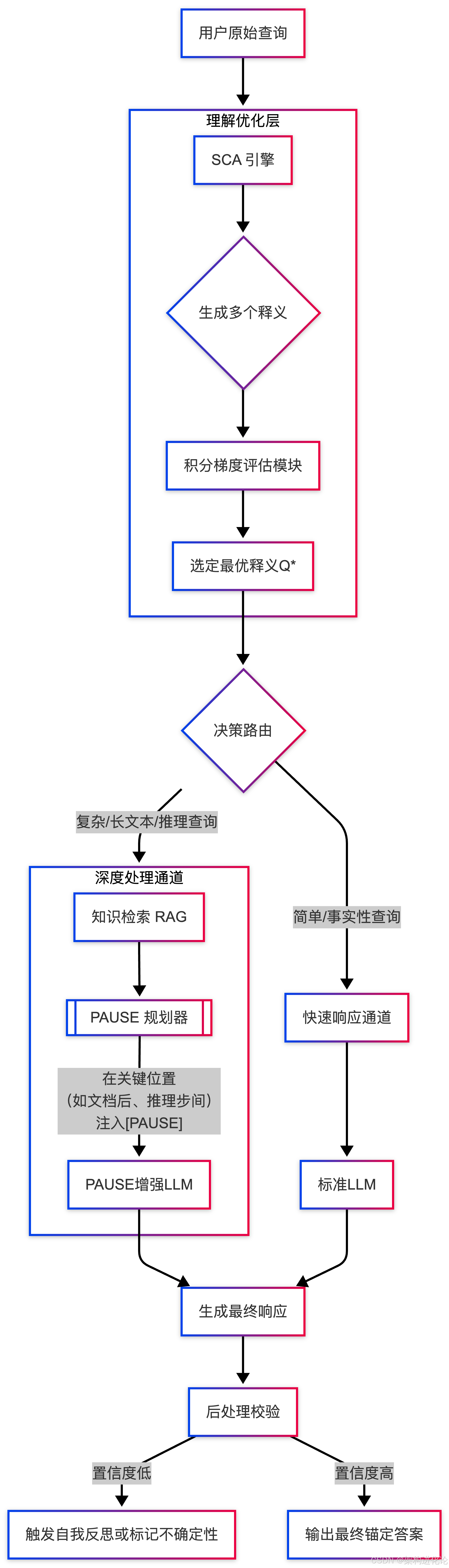 理解锚定:所有用户查询先经过SCA引擎,被重述为最清晰、最易被模型全面理解的版本(Q*)。