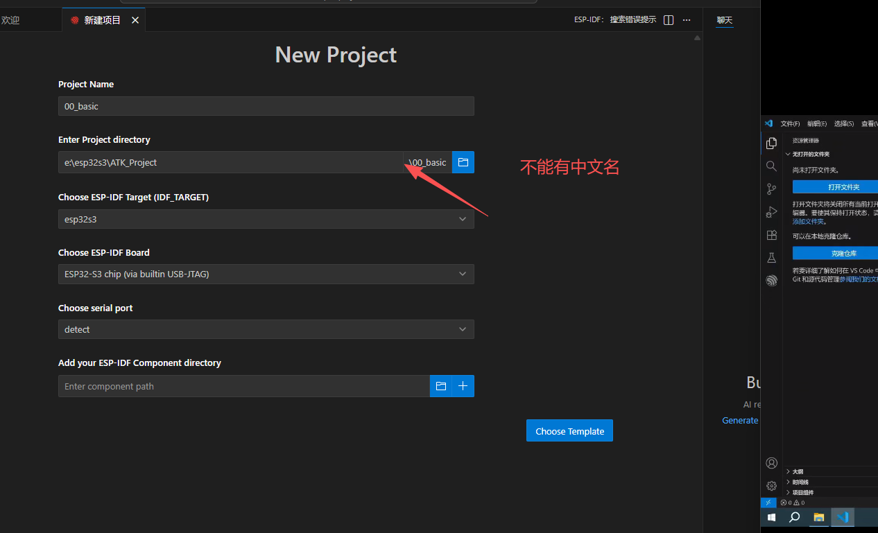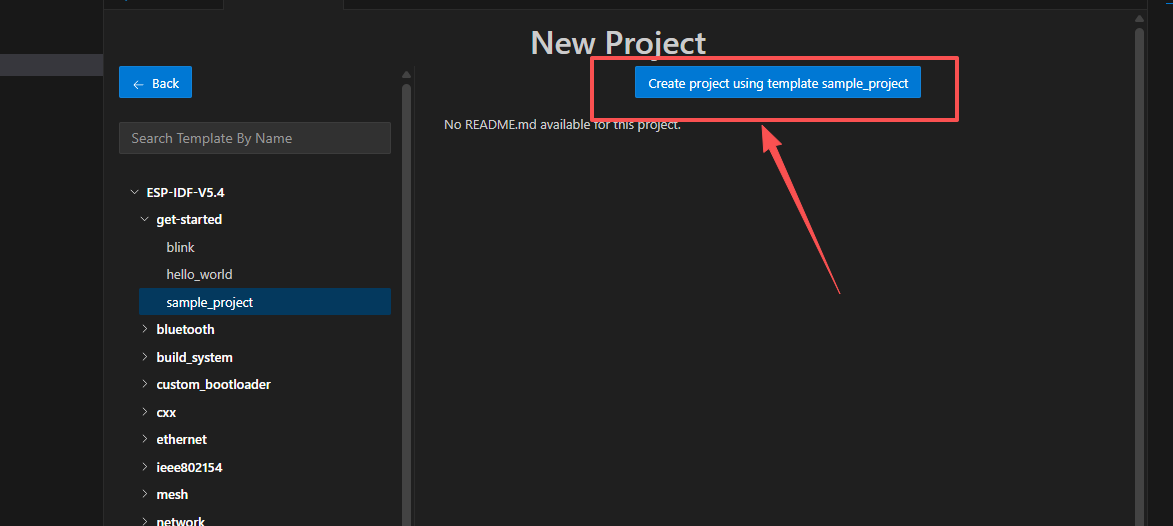 - 选择已安装的ESP-IDF v5.4框架作为项目基础。