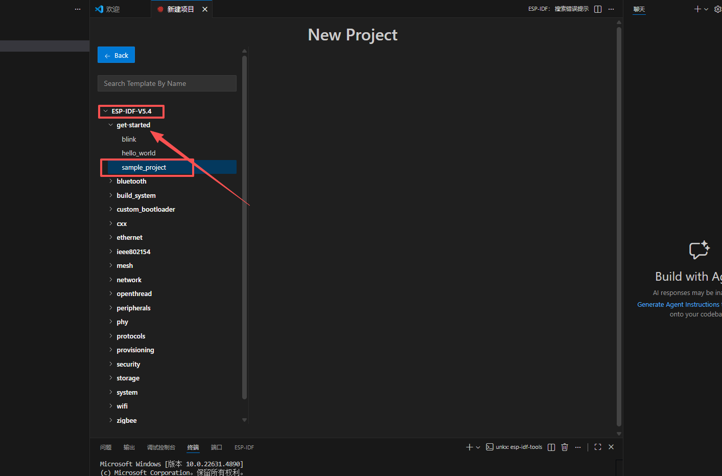 - 在esp-idf-v5.4/tools目录下找到template,复制sample_project到examples/get-started目录。
