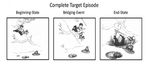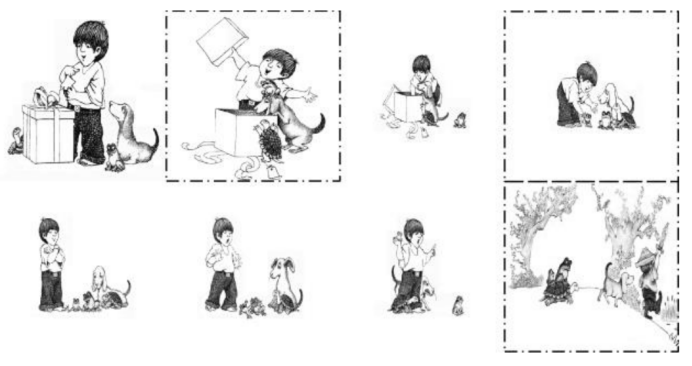 一项研究对视觉叙事的事件切割进行了研究。首先参与者需要阅读一个故事,随后被试会看一组关于某个故事的图片集。被试的任务是当他们认为故事情境发生变化时,则点击该图片。故事中包含许多变化,尽管并非每张图片都与一个变化相对应。点击图片后,被试会看到该图片周围有一个虚线边框,表示该图片是故事的一个边界事件。如图4所示,这个故事包含8张图片,其中3张带有虚线边框。这三个边界图片似乎处于不同的分割粒度。第三个边界图片似乎是一个粗略的事件边界标记,这意味着一个新的更大的事件的开始,这是因为地点、时间、动作和目标都发生了很大的变化(即从室内到森林,需要更长时间到达那里,角色们从拆礼物到正在旅行,目的是未知)。前两个边界图片是两个较细的分割粒度,因为它们似乎是一个较大事件(即收到礼物以及角色之间的互动)的两个子事件,其中这两个子事件分别是打开礼物和发现一只新的青蛙。(Magliano,Loschky,Clinton和Larson,2013)