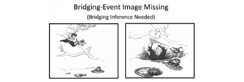 推理是映射的一种方式,包括因果推理、目的推理和连接性推理。如图1所示,图(a)的漫画描述了一个较为完整的故事,它们由开始状态、连接事件和结束状态组成(每张图片均没有文字描述);而图(b)缺少了这个漫画的连接事件,只有开始状态和结束状态,当读者观看图(b)时,为了维持故事的连贯性,需要对连接事件进行推理构建。比如在例中,被试需要思考是什么原因使男孩和小狗掉入水中。生活中连接性推理是常见的,比如在你参与的一件事件中,你中途离开了一段时间,在你返回后会根据当前状态和其他信息推测中间离开阶段发生了什么。在最近的一项研究(Magliano,Larson,Higgs和Loschky,2016)中,研究者设置了两种条件,一种是显示三种状态的阅读条件,另外一种是缺少了连接事件的推理条件。实验要求观众在电脑屏幕上观看这些图片故事,一次展示一张图像,并在看完结束状态图像后说出你对故事的思考。这项研究的一个发现是,在推理条件,由于连接事件被推理得出,被试更倾向于提到连接事件动作。这说明,当连接事件是通过生成推理的方式得出来时,会导致它在情景模型中被高度激活。相反,如果只是简单地看到它,则不会有这种现象;另外一个发现是,相比阅读条件,推理条件下观看结束图片所花的时间更长(“平均约2450毫秒”对比“平均约2800毫秒”)。研究者认为,比起简单的阅读,生成连接推论的时间会更长。这两个发现一致认为,被试在推理条件下确实会产生连接性推理。