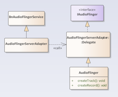 AF对上层提供Binder服务,从 Android 12/13 开始,为了将Binder服务与具体业务实现分离,通过 Delegate 接口定义核心功能契约,所以AudioFlinger继承于IAudioFlinger 接口,而不是直接继承于BnAudioFlingerService,如图2所示: