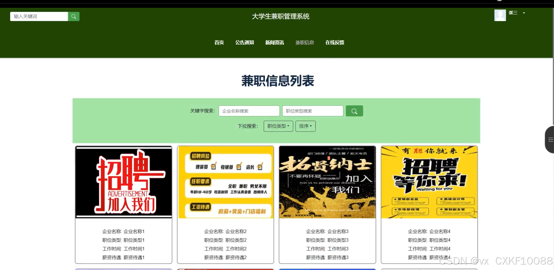 用户进入兼职信息页面,浏览兼职信息的图片、名称、描述等基本信息。通过搜索栏输入关键词或筛选条件,快速定位兼职信息界面。可以进行申请和咨询。兼职信息界面如下图所示。