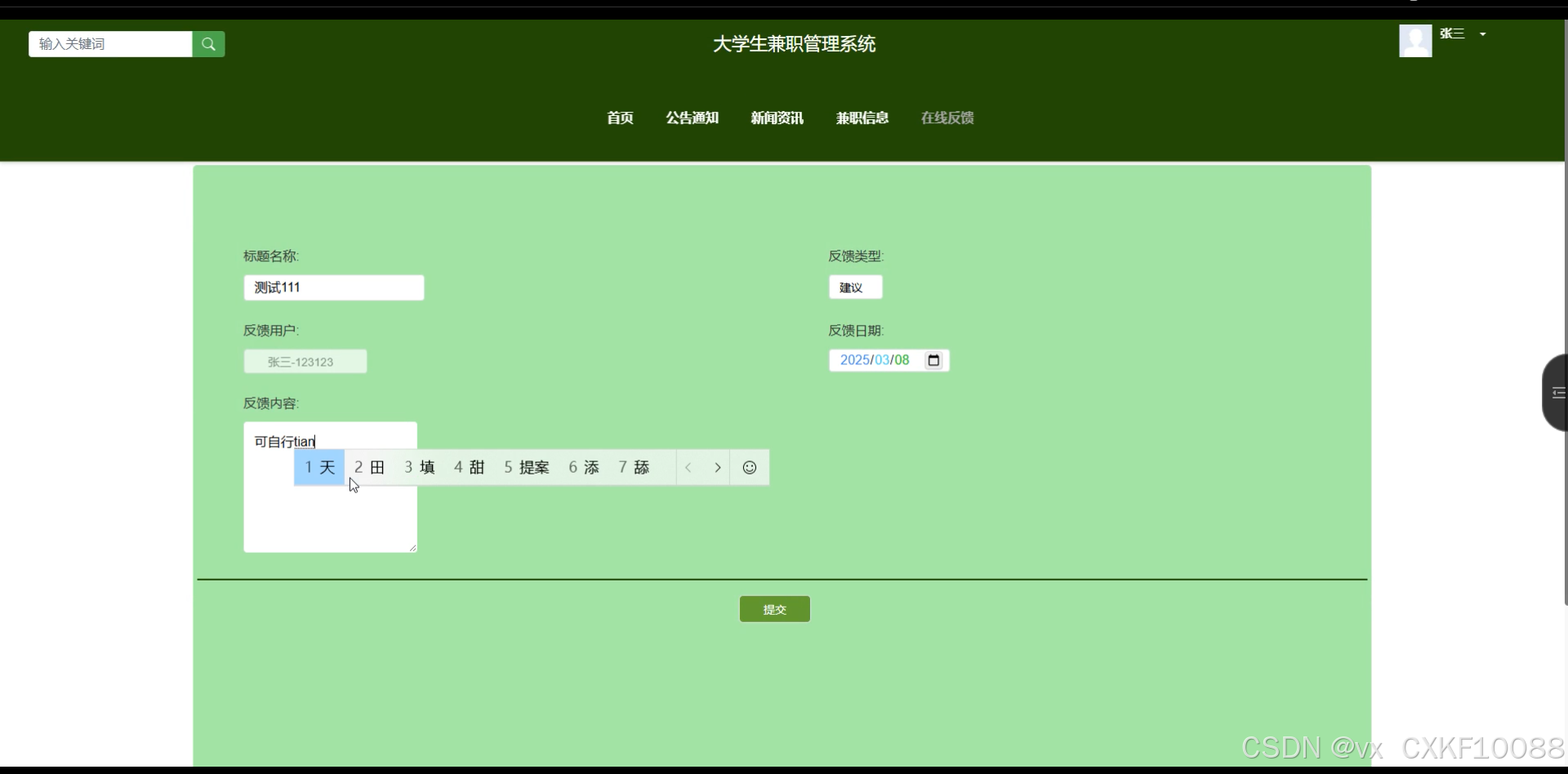 提供在线反馈功能,学生可以在平台上提交反馈,表达对系统功能、兼职信息、服务质量等方面的建议或问题,以帮助平台改进和优化服务。在线反馈界面如下图所示。