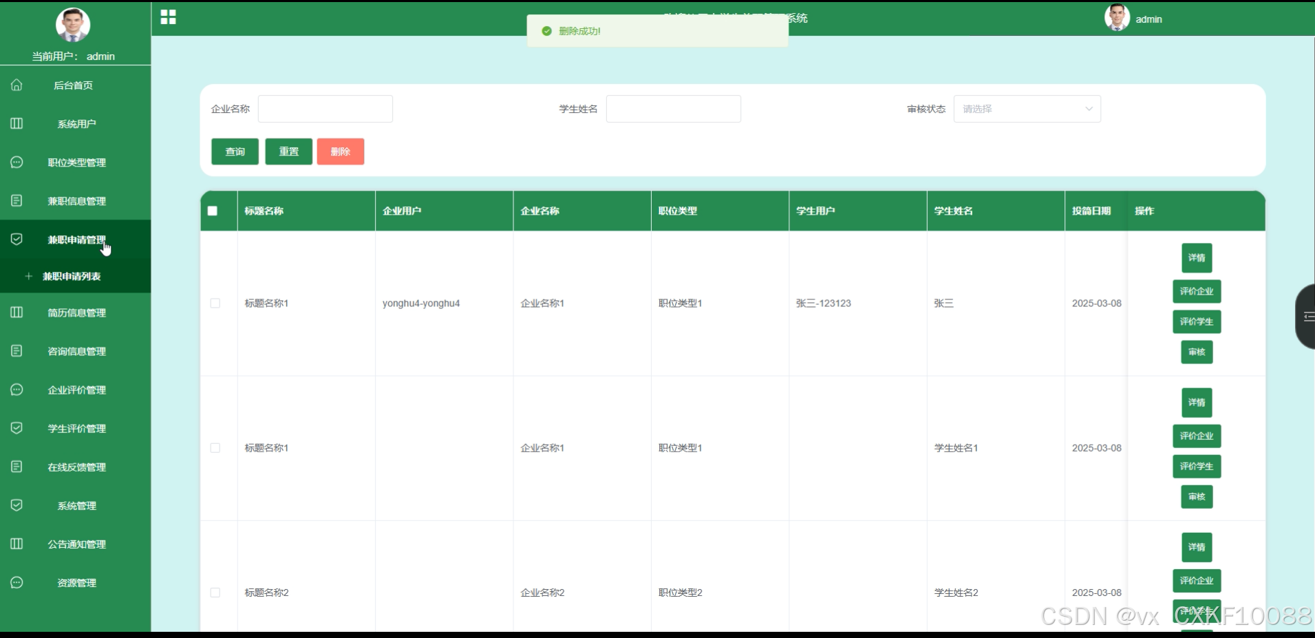 管理员点击“兼职申请管理”这一菜单会显示兼职申请列表这个子菜单,点击“兼职申请列表”可以查看兼职申请详情,可以进行查询、重置、删除、审核、评价企业和评价学生等操作。兼职申请管理界面如下图所示。