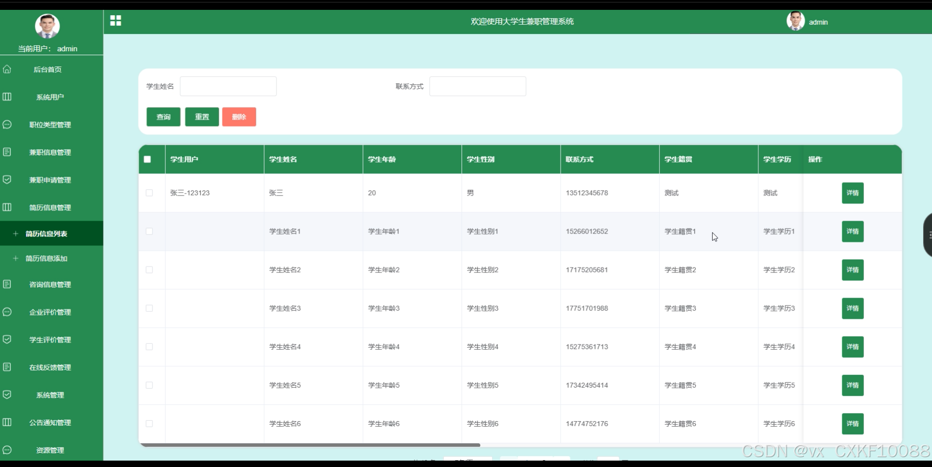 在“系统用户”模块下,管理员可以管理系统上的三类用户:管理员、学生用户和企业用户。管理员可以进行用户的增、删、改、查操作,包括设置权限、修改用户信息等。系统用户界面如下图所示。