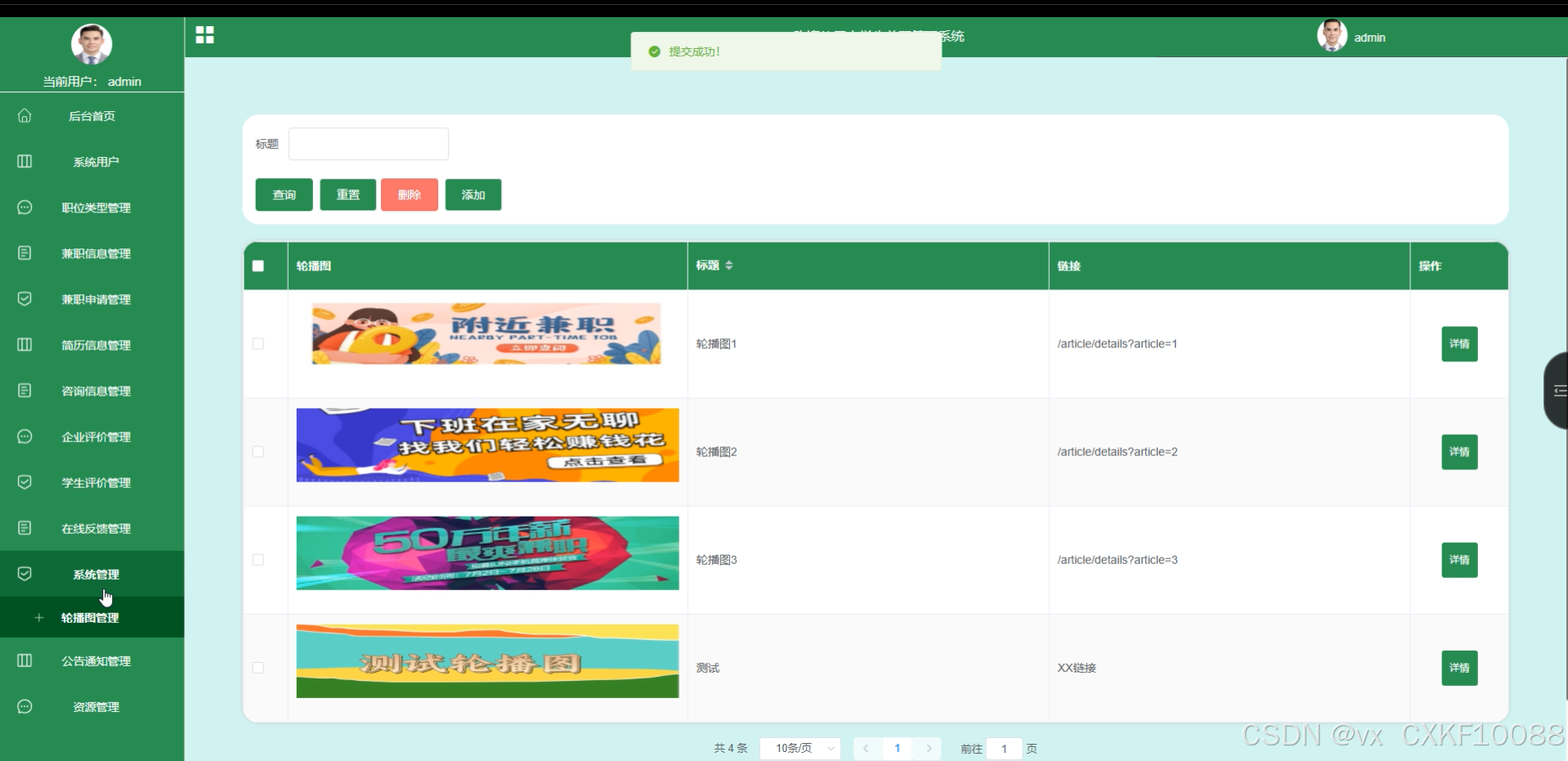 管理员点击“系统管理”菜单,可以对前台展示的轮播图进行设置,系统管理界面如下图所示。