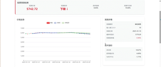 预测分析模块:预测分析模块是系统的核心模块,负责使用训练好的 LSTM 模型对股票价格进行预测,并提供预测结果分析和可视化展示功能。用户在预测分析页面输入股票代码和预测周期,后端接收到请求后,从数据库中获取该股票的历史数据,并对数据进行预处理和特征工程,将处理后的数据输入到训练好的 LSTM 模型中进行预测。模型预测完成后,将预测结果返回给前端页面进行展示。在预测结果展示页面,以折线图的形式展示股票价格的历史走势和预测走势,让用户直观地了解股票价格的未来趋势。还提供预测结果分析功能,对预测结果进行评估和分析,计算预测准确率、均方误差等指标,帮助用户了解预测结果的可靠性。结合历史数据和预测结果,分析股票价格的波动原因和影响因素,为用户提供投资建议和风险提示。在预测分析模块中,还支持多模型对比分析功能,用户可以选择不同的预测模型,如传统的时间序列预测模型 ARIMA、支持向量机(SVM)模型等,与 LSTM 模型的预测结果进行对比,评估不同模型的性能,选择最适合的预测模型。