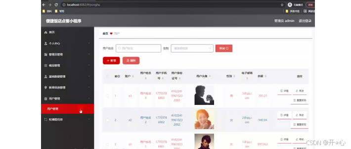 如图5.1显示的就是用户信息管理页面,此页面提供给管理员的功能有:用户信息的查询管理,可以删除用户信息、修改用户信息、新增用户信息,