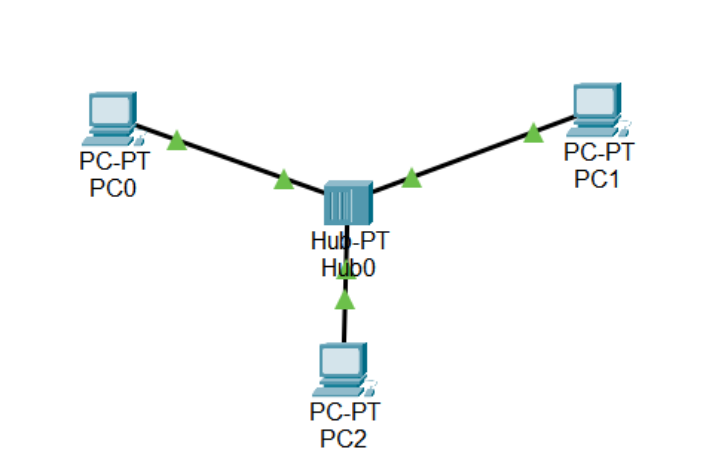 (1) 第一步:构建网络拓扑:在逻辑工作空间上,拖动三个终端设备和一个集线器,用连接线把设备连接起来。如图1所示。