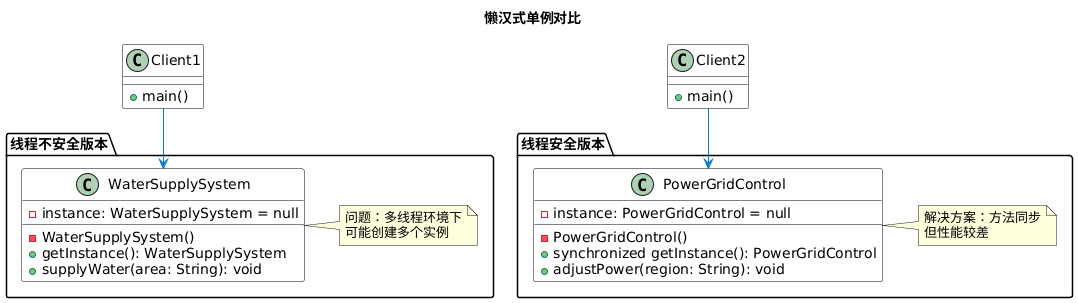 - 缺点:线程不安全(多线程并发调用时可能创建多个实例);