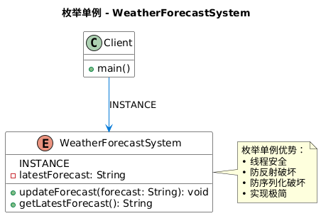 利用Java枚举的特性:枚举实例默认线程安全、仅初始化一次,且天然防止反射和序列化破坏单例。