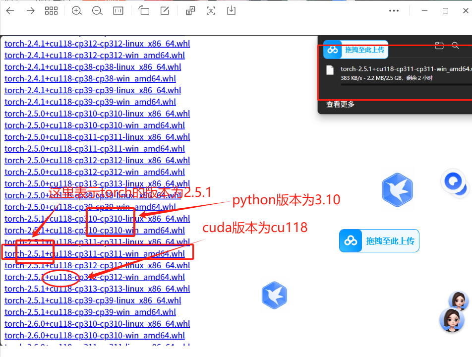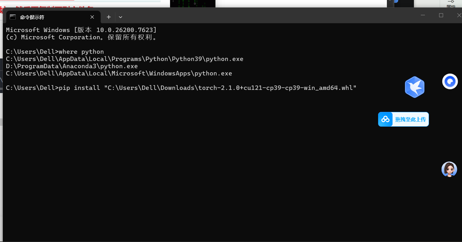 可以使用网页查找命令,长按ctrl+F,然后输入需要的版本,cu表示安装的cuda版本,cp表示python版本,例如下图所示,我下载的是torch2.5.1,cuda版本可以比安装的版本低,但是不能比安装的版本高,python版本为3.9,python版本可以在命令提示符内输入命令python或者where python查看,如下图所示