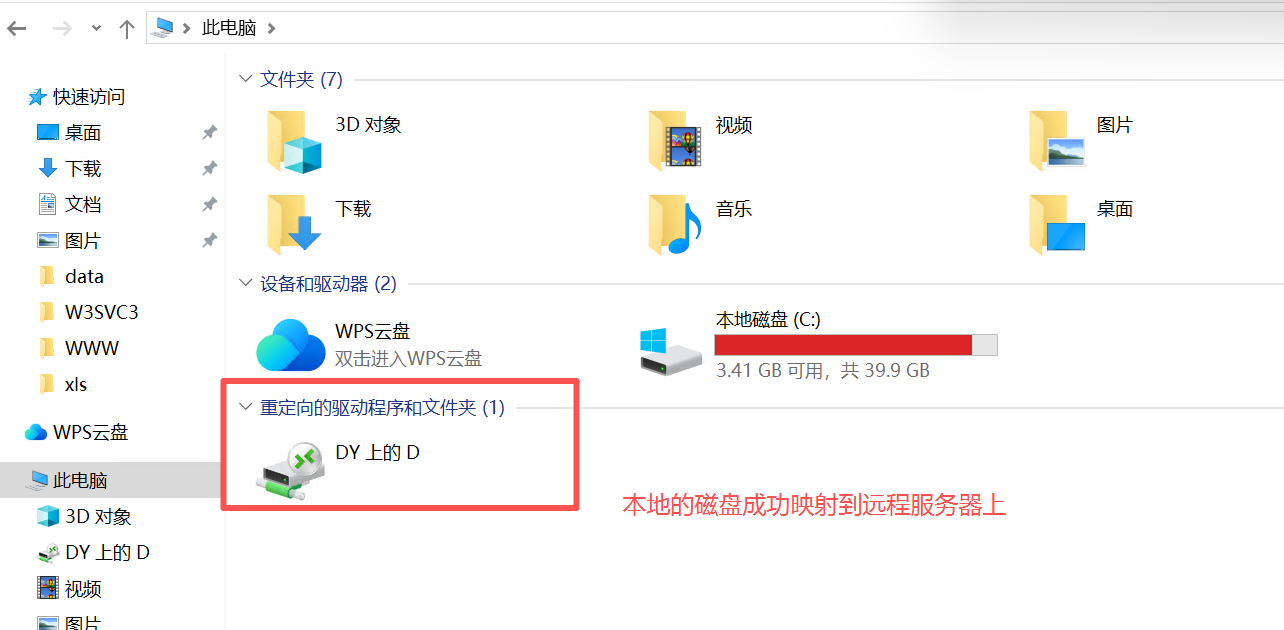 在远程服务器上访问你的本地磁盘,登录后,打开 “此电脑” 或 “我的电脑”,可以看到映射的本地磁盘,这样就可以把服务器上的数据库文件复制到本地