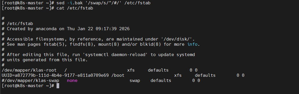 sed -i.bak '/swap/s/^/#/' /etc/fstab