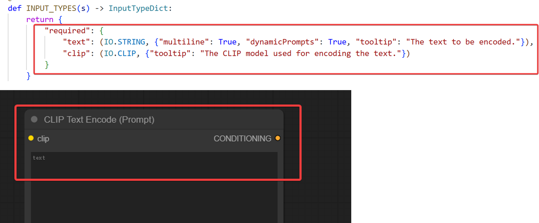 我们在这里写入需要需要写入的字段内容,也就是在界面中定义界面中操作。我们这里的界面可以看到当前设置的对象针对的是Text Encoder,这里的Required 代表是必须要连接的节点