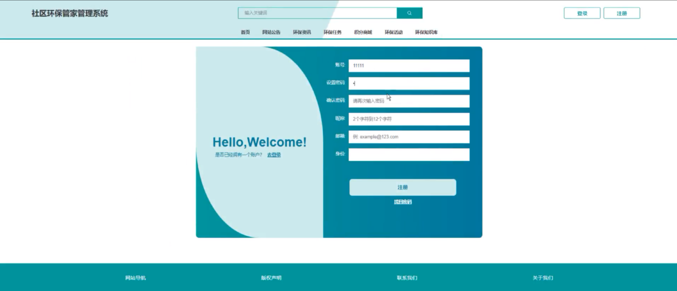 社区环保管家管理系统为居民用户提供了一个便捷的注册入口。用户只需填写基本信息,如账号、密码、昵称和邮箱等,即可快速完成注册。注册后,居民用户可以享受系统提供的各类环保服务和信息查询功能。注册界面如下图所示。