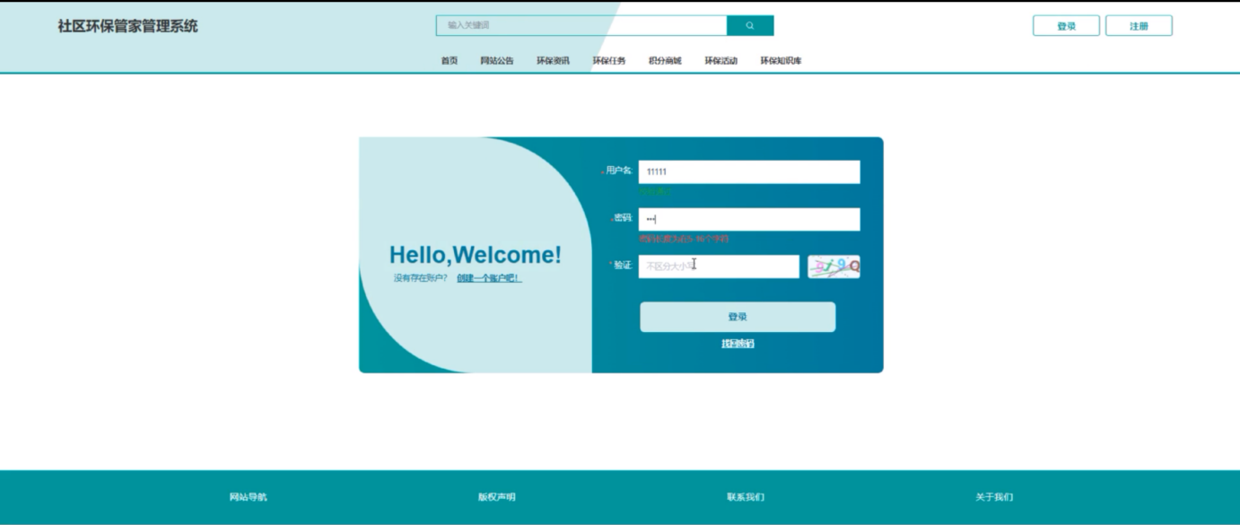 社区环保管家管理系统为居民用户提供了一个便捷的登录界面。用户只需输入用户名和密码,并通过验证码验证,即可轻松登录系统。登录后,居民用户可以访问各类环保信息和服务功能。登录界面如下图所示。