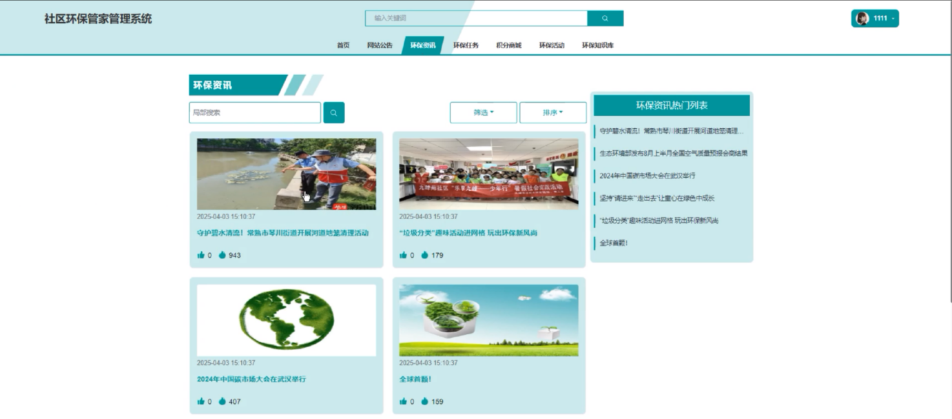环保资讯页面为居民用户提供了一个丰富的信息平台。用户可以在这里浏览最新的环保新闻、活动报道和政策动态,通过图文并茂的形式了解各类环保知识和实践案例。页面还设有搜索和筛选功能,帮助用户快速找到感兴趣的内容。界面如下图所示。