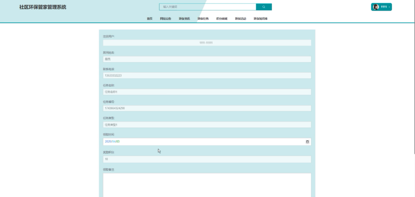 环保任务:环保任务页面为居民用户提供了一个参与环保活动的平台。用户可以在这里浏览和选择各种类型的环保任务,查看任务详情是可点击“领取”按钮领取环保任务,领取时系统会显示任务名称、任务类型、领取时间和奖励积分等详细信息,确保用户清晰了解任务要求和奖励机制。界面如下图所示。