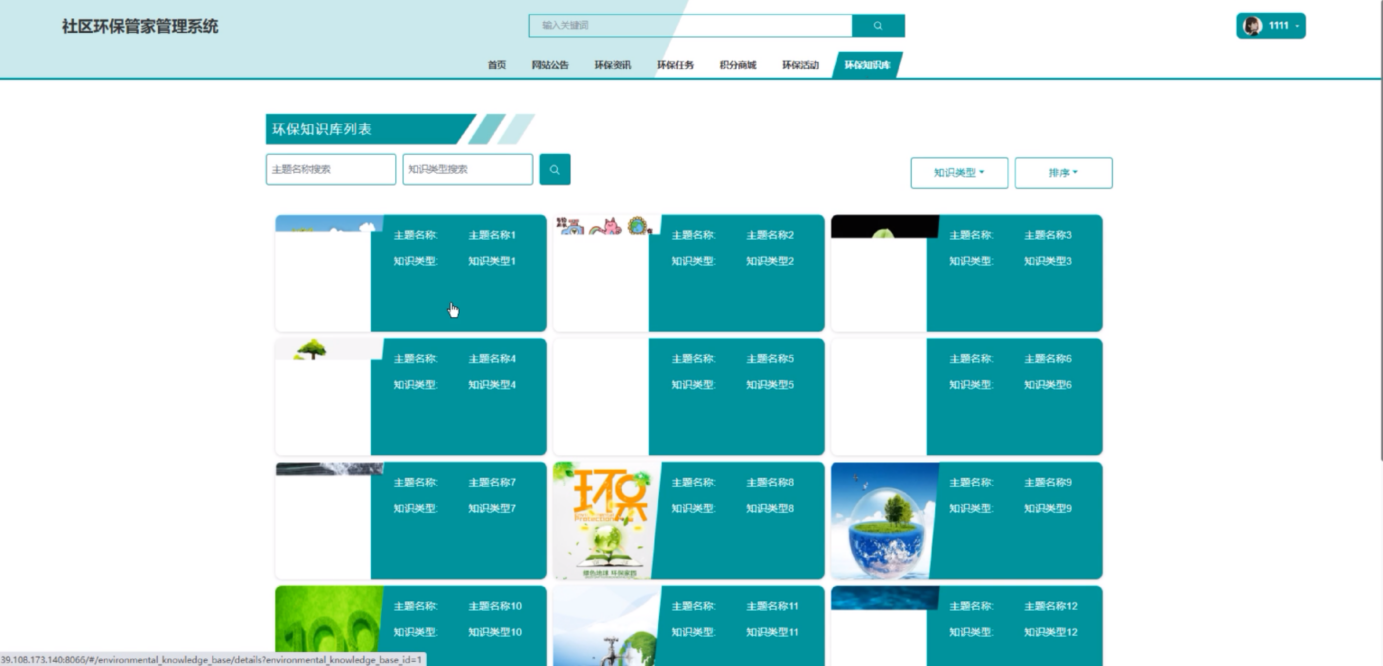 环保知识库:环保知识库为居民用户提供了一个全面的环保信息平台。用户可以在这里通过主题名称和知识类型搜索,轻松找到各类环保知识、科普文章和视频,提升环保意识和实践能力。同时可对环保知识进行点赞、收藏和评论。界面如下图所示。
