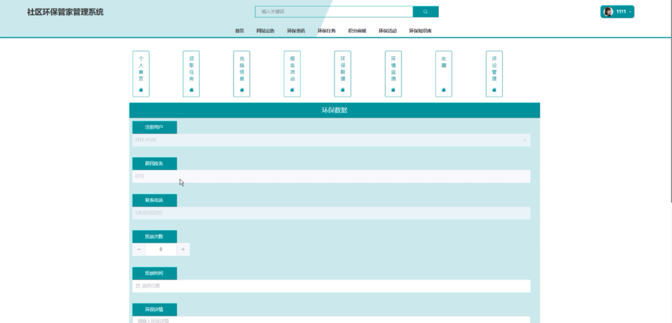 环保数据:点击进入“环保数据”页面可添加数据信息,包括注册用户、居民姓名、联系电话、投放次数、投放时间、环保详情。