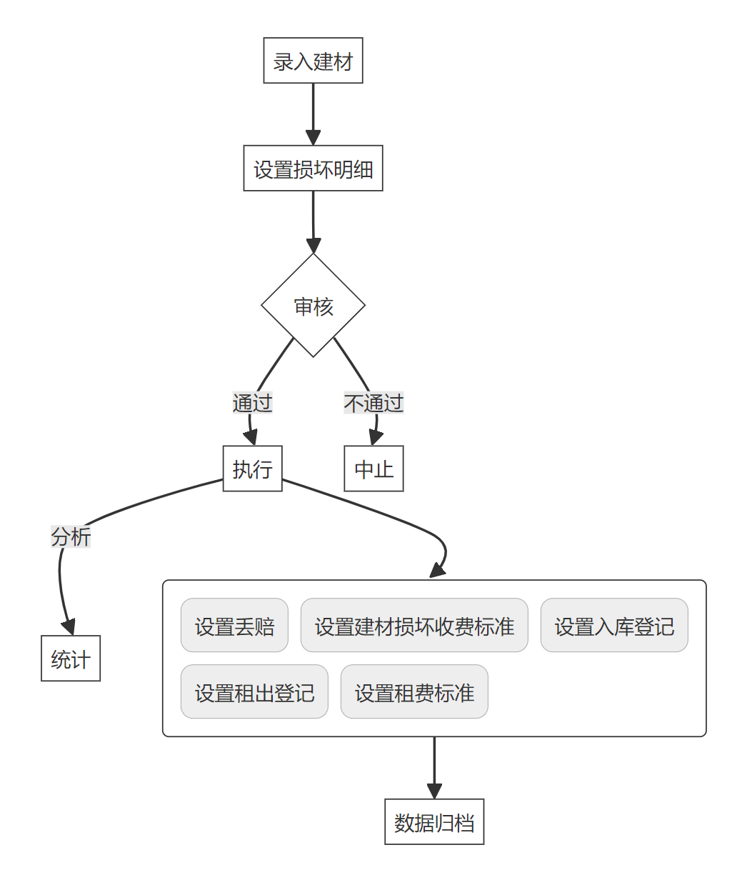 建材管理功能定义涵盖数据录入、查询、变更及审核。数据录入涉及填写建材编码、名称、规格型号等;通过表单界面实现便捷输入,确保准确性与完整性。查询则支持模糊检索和多条件筛选,包括编码范围、类别等维度,便于快速定位所需信息。信息变更允许对已存记录进行编辑或删除操作,并需满足业务规则约束(如库存数量变化引起价格调整)。数据审核由部门领导执行,通过对比实际使用与历史记录差异确保准确性;统计分析则生成报表以展示各类建材的采购、租赁及损耗情况,支持导出PDF格式供决策参考。