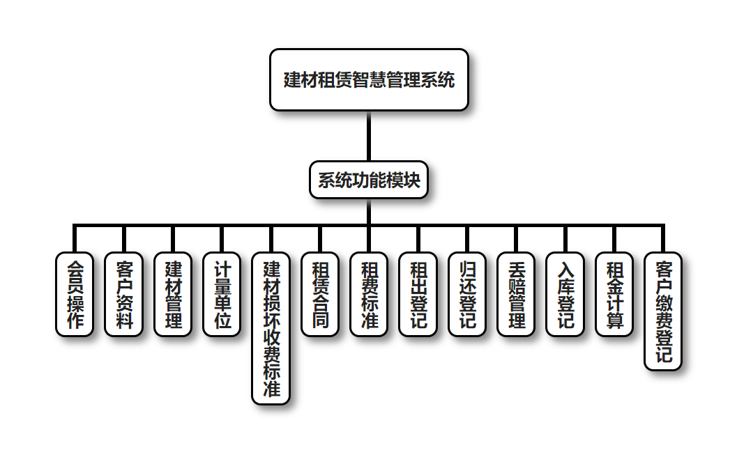 建材租赁智慧管理系统的主要功能包括:会员操作管理、客户资料管理、建材管理、计量单位管理、建材损坏收费标准管理、租赁合同管理、租费标准管理、租出登记管理、归还登记管理、丢赔管理、入库登记管理、租金计算管理、客户缴费登记管理。