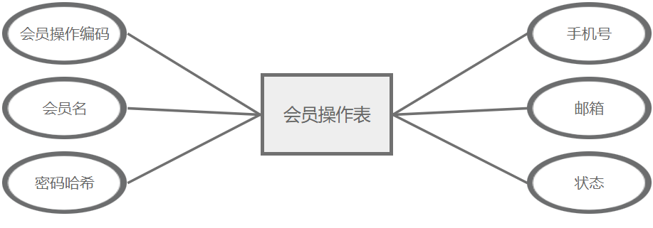 会员操作管理主要属性包括:会员操作编码、会员名、密码哈希、手机号、邮箱、状态。