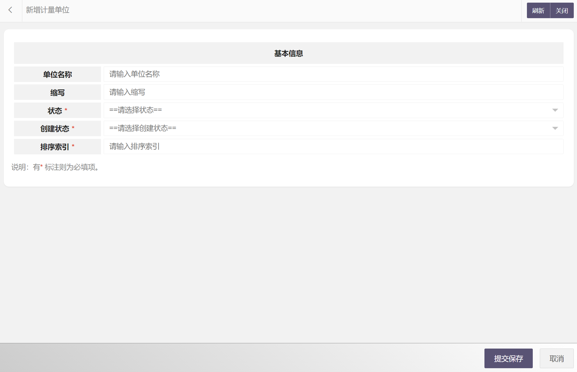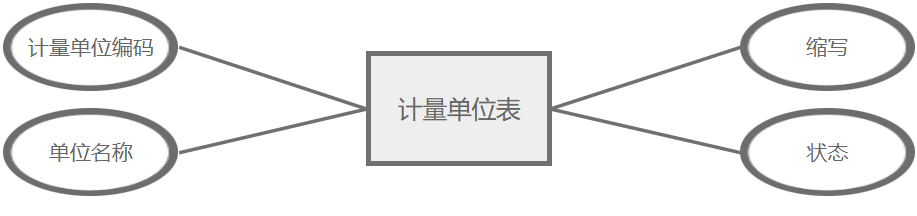 计量单位管理主要属性包括:计量单位编码、单位名称、缩写、状态。