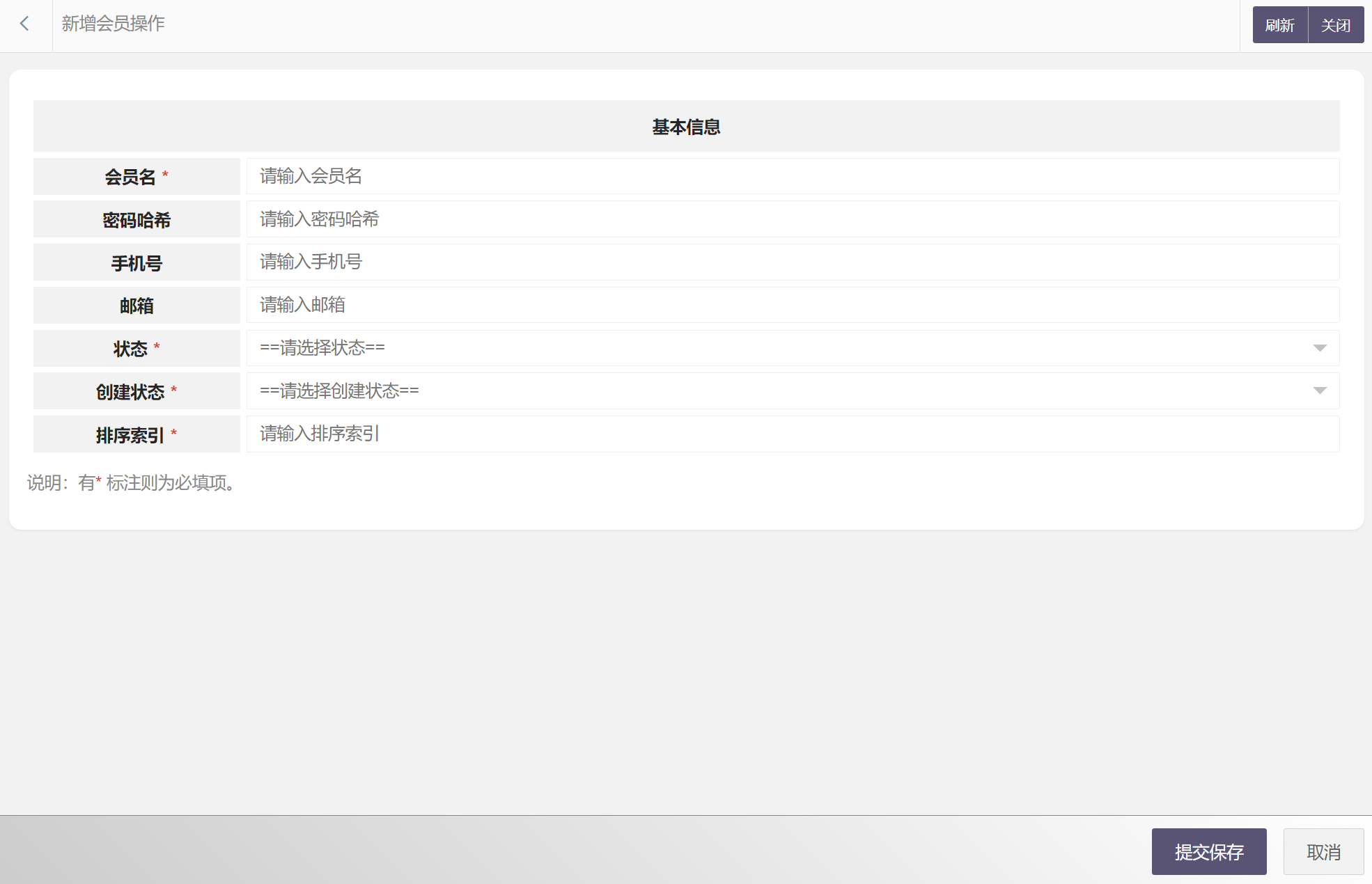 在会员操作列表中可以选择新增会员操作、编辑会员操作、删除会员操作、搜索会员操作等。会员操作属性包括:会员操作编码、会员名、密码哈希、手机号、邮箱、状态等。新增会员操作界面如图所示: