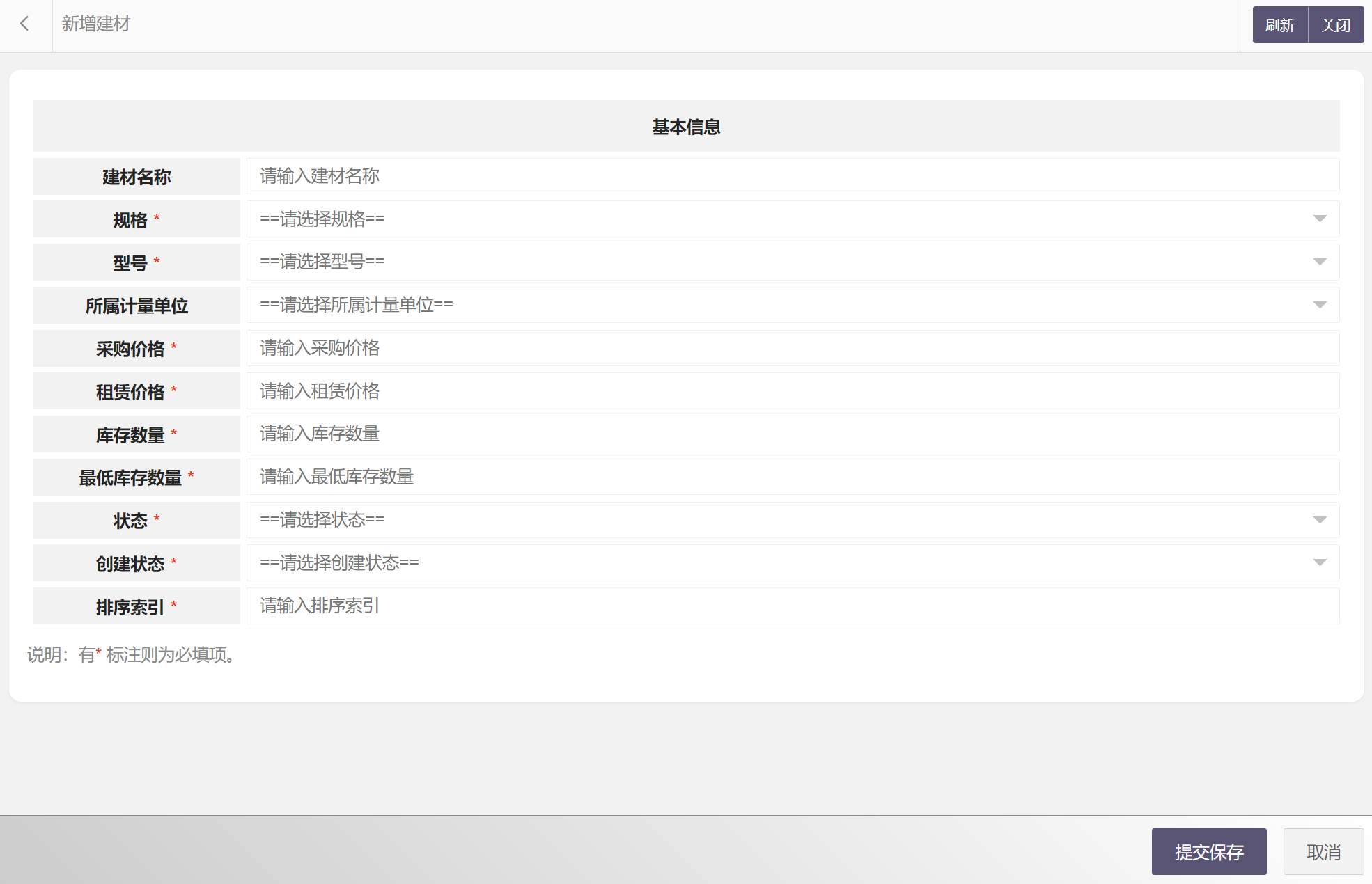 建材管理主要属性包括:建材编码、建材名称、规格、型号、所属计量单位、采购价格、租赁价格、库存数量、最低库存数量、状态。