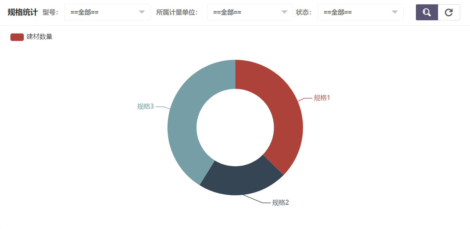 在建材统计中可以看到规格统计、型号统计、所属计量单位统计、状态统计,规格统计如图所示: