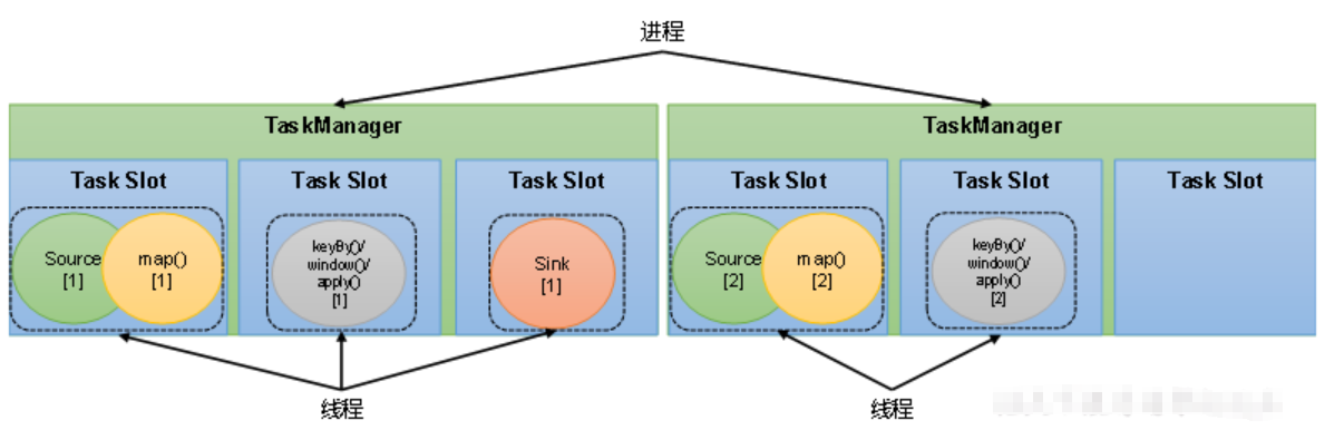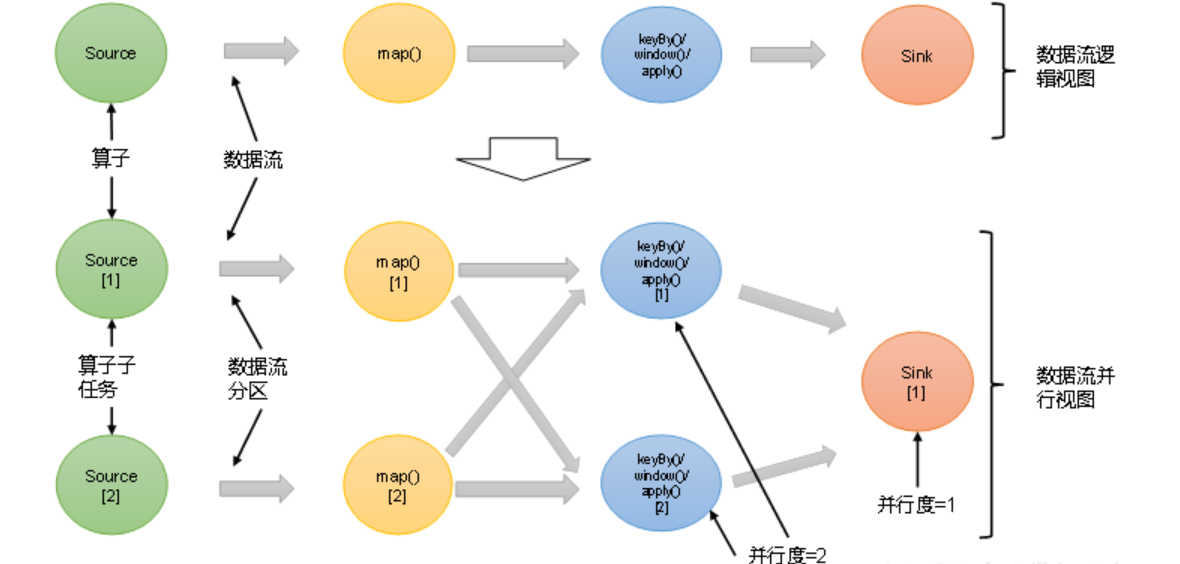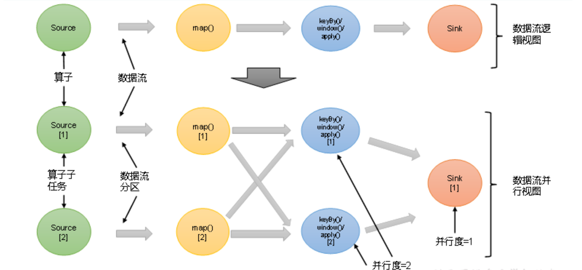 - 并行度 = 8 → 8 个人一起削,理论上快 8 倍 Flink 里每一个算子(source、map、keyBy/window、sink)都可以单独设置并行度。