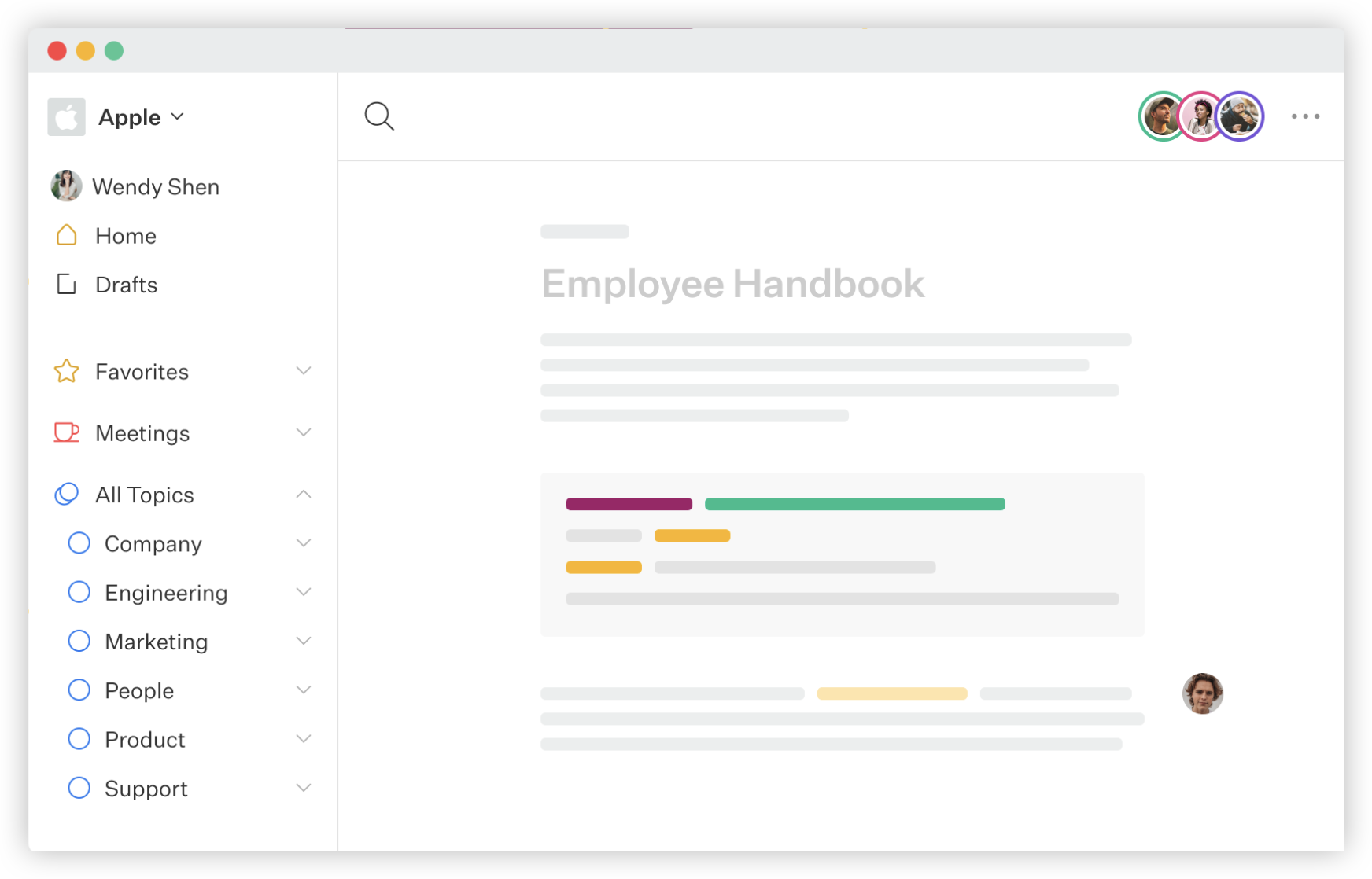 一句话定位:Slab 的文档协作强调“干净的写作体验 + 快速共享”,它把知识组织核心放在 Topics(主题)上,既用于分类,也用于给内容提供上下文,让企业知识库不只是“文件夹堆叠”。