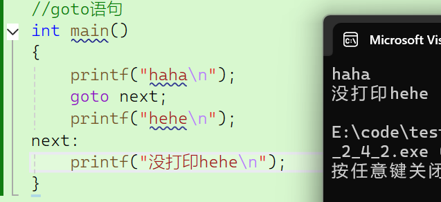 可以跳转至某一标签处,标签名字可以自定,当然,goto语句只能在一个函数区间内使用,不能跨函数使用。