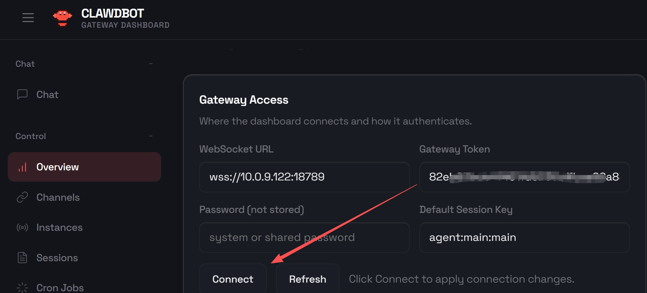 找到.clawdbot/clawdbot.json文件里面的token,很长,拷贝,然后 点击Connect