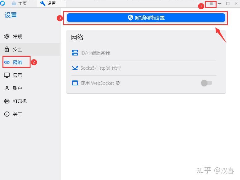 1、点击下图①打开设置界面,然后选中②【网络】页签,最后点击③【解锁网络设置】
