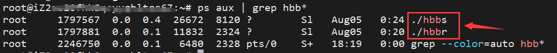 5、问题解答 1、服务器端部署完成之后,先确认是否服务启动功能,输入命令:ps aux | grep hbb* ,如果如下图所示,则表示服务启动成功。