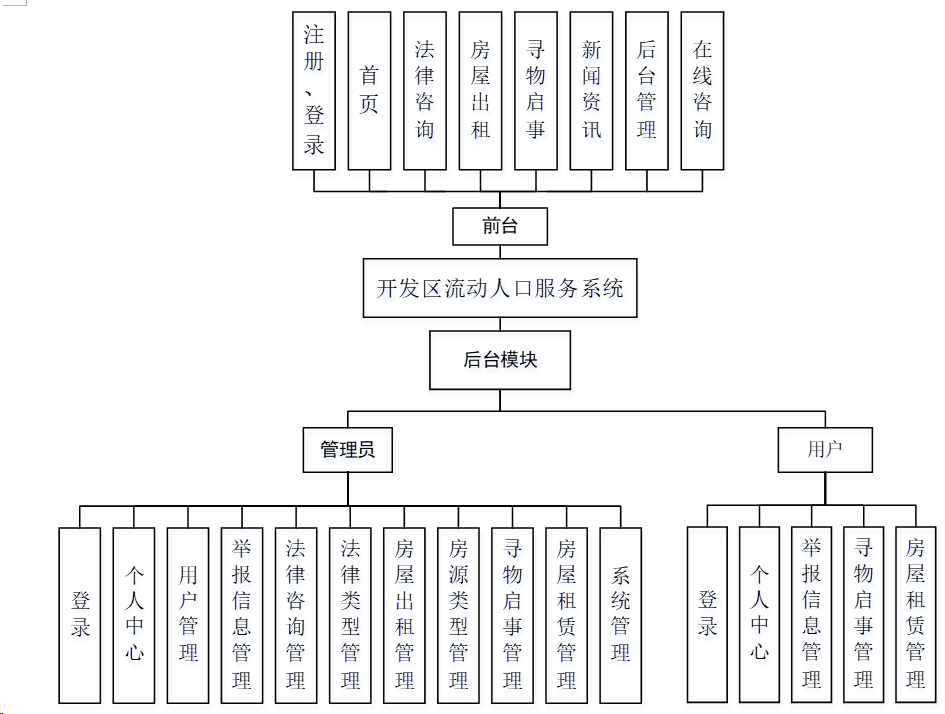 管理员模块属于是网站的后台,进入之后有大量的管理员功能,管理员也可以使用用户模块的功能,为了维护网站的稳定与页面的布局,将管理员模块的功能详细化后可以使用系统管理对页面进行布局修改,可以发布公告提示用户规范,用户模块只可以对个人信息、登录密码、举报信息、寻物启事、房屋租赁等进行管理等,并且进行在线租赁房屋、支付等,开发区流动人口服务系统总体结构图如图4-2所示。