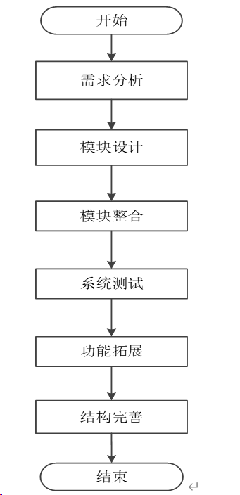 系统的开发流程设计简单的介绍了开发过程,先对任务书进行分析,根据要实现的功能对各个模块进行开发,之后再对模块一一进行测试,测试成功后将模块整合再测试整体功能,完善整体结构[6]。开发系统流程图如图4-3所示。