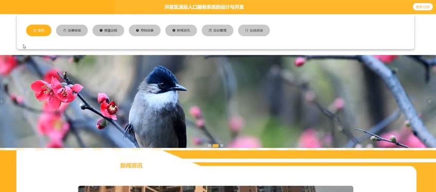 当人们打开系统的网址后,首先看到的就是首页界面。在这里,人们能够看到开发区流动人口服务系统的导航条和新闻资讯推荐信息等。系统首页界面如图5-1所示:
