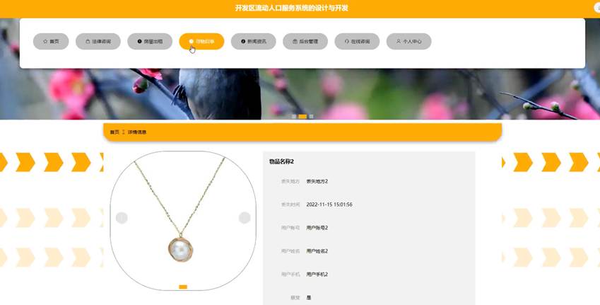 用户通过注册、登录到系统前台后,在寻物启事列表页面输入物品名称、丢失地方进行查询的操作;在寻物启事详情页面,用户可以查看寻物启事详细信息,并进行在线评论的操作,具体操作页面如图5-3所示: