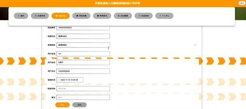 系统核心功能涵盖个人中心、用户管理、举报信息管理、法律咨询管理、法律类型管理、房屋出租管理、房源类型管理、寻物启事管理、房屋租赁管理、系统管理等。流动人口可通过系统获取法律咨询服务、查找房屋租赁信息、发布寻物启事,管理员可对各类信息进行统筹管理与审核。系统采用 Java 语言、SpringBoot 框架、MySQL 数据库和 B/S 架构,具备功能全面、操作便捷、安全性高的特点,为开发区流动人口提供一站式服务解决方案,同时规范服务管理流程。