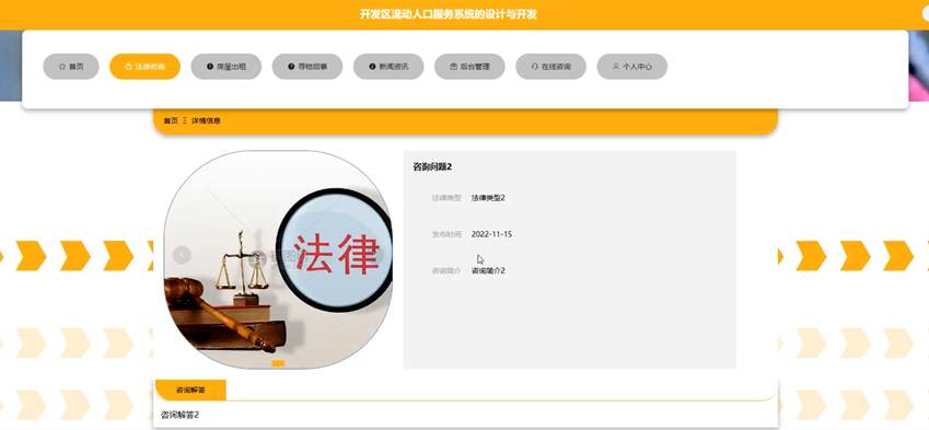在法律咨询列表页面,用户通过输入咨询问题来查询相关信息;在法律咨询详情页面,用户可以查看法律咨询详细信息,具体操作页面如图5-6所示: