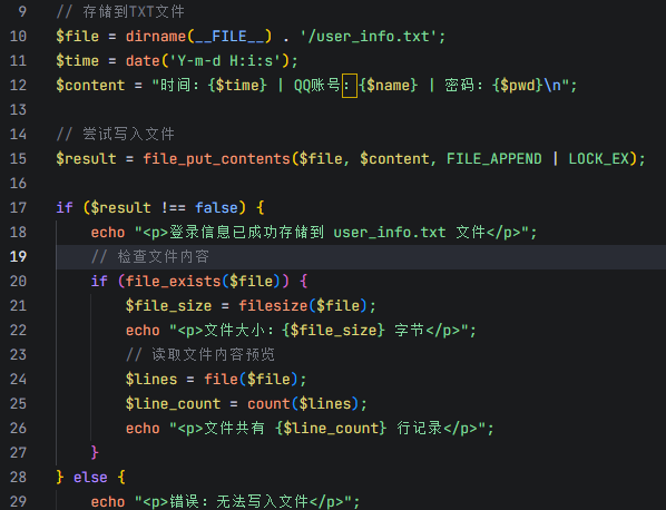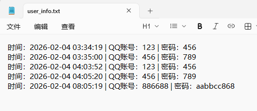 在这个代码下面添加储存功能,把对方每次登录的时间、账号和密码都记录到本地服务器的user_info.txt 文本中