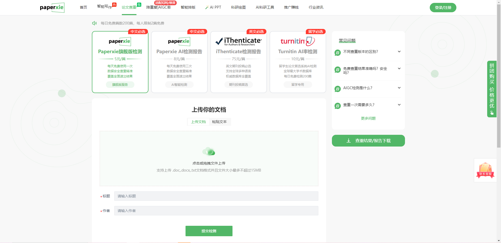 真正让 paperxie 脱颖而出的,远不止 “每日 200 篇免费” 这一项福利。针对不同用户的细分需求,平台搭建了一套完整的检测矩阵,从中文到英文,从初稿到终稿,从学术论文到期刊投稿,都能找到对应的解决方案。