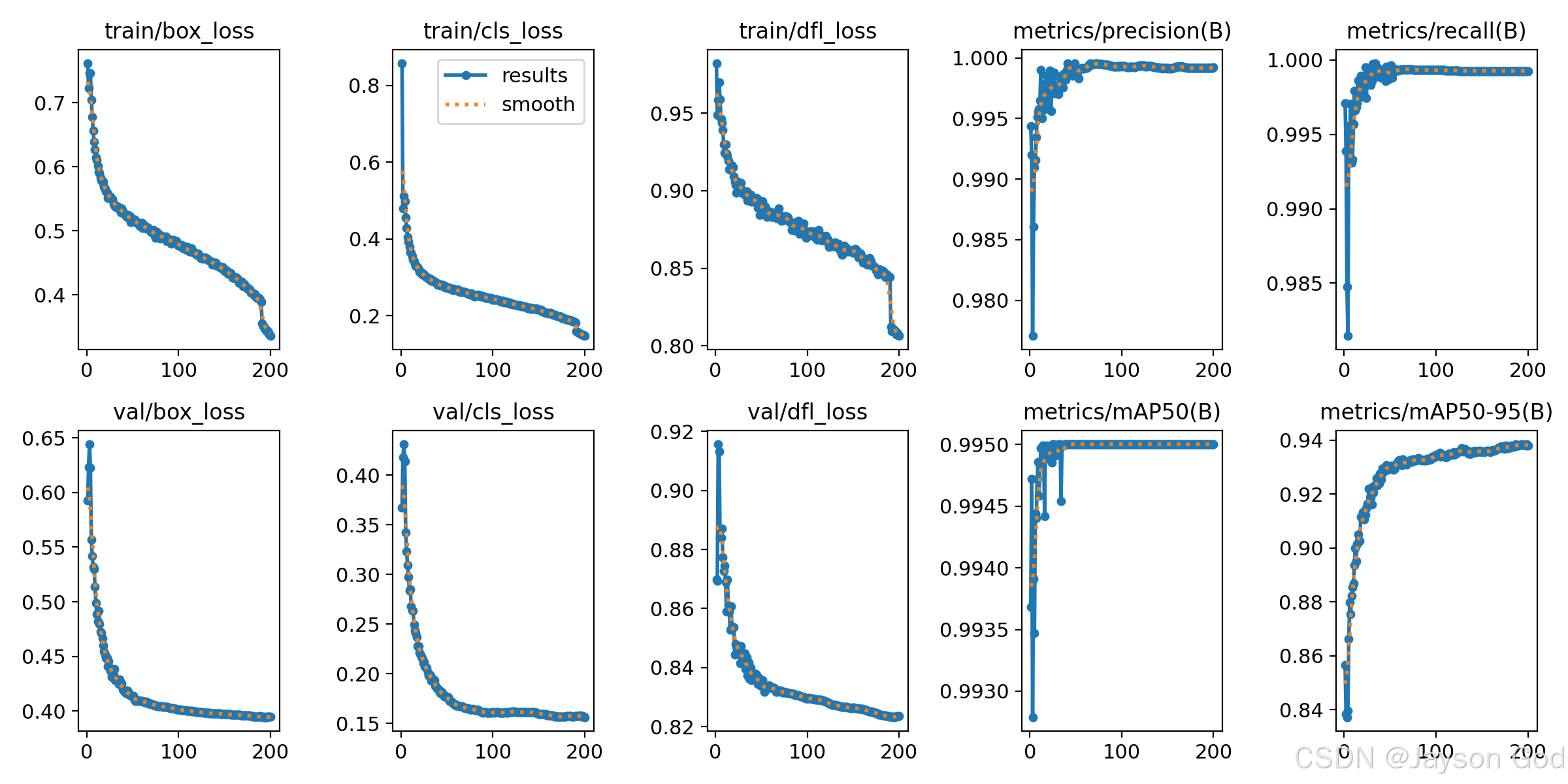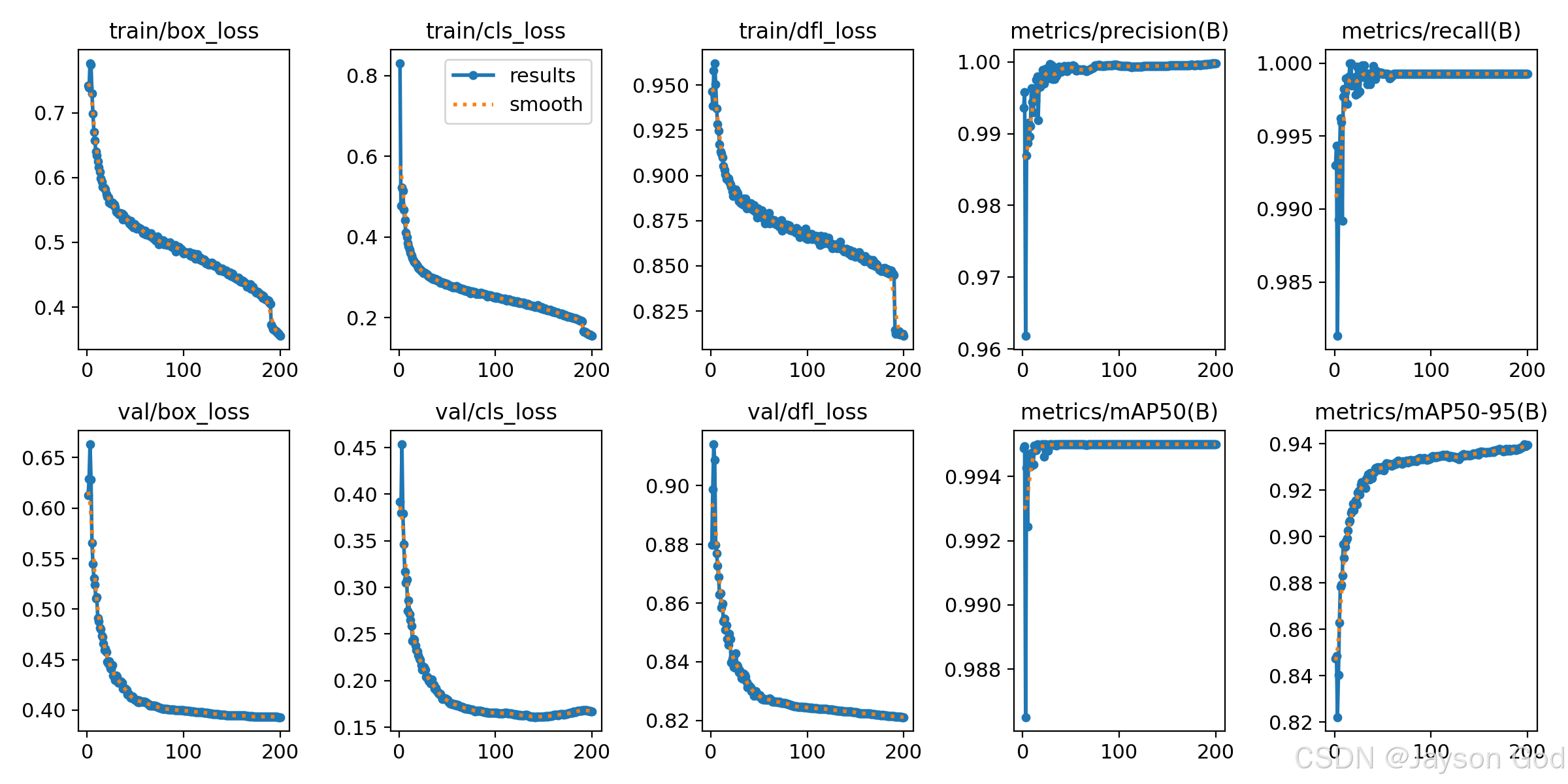 模型表现非常出色,在200个epochs的训练过程中各项指标持续优化,最终达到顶尖水平: